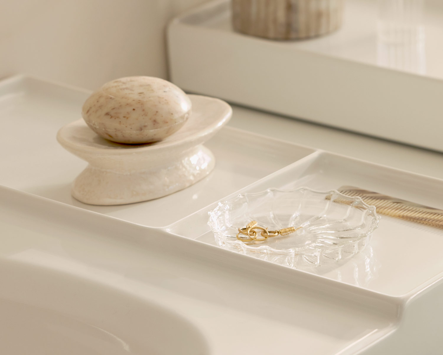Bowls made of porcelain or glass with delicate decorations as well as old wooden boxes are a perfect addition to any vintage-style bathroom. They're not only decorative, but also practical.