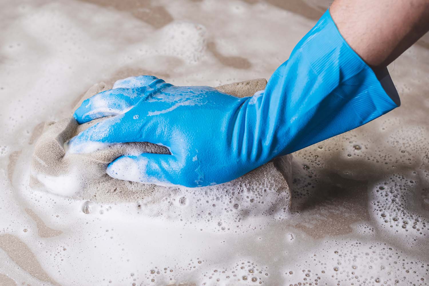 Even if you only use household items, it's still a good idea to wear gloves when cleaning bathroom grout. It's especially important to wear them if you're working with stronger chemical cleaners or concentrated vinegar.