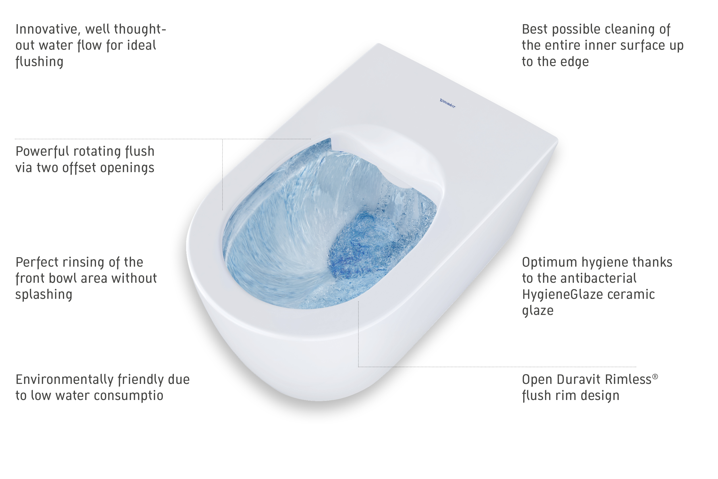 Duravit Rimless® technology enables an hygienic, open flushing rim design and at the same time an innovative and efficient water flow for the best flushing performance without overspraying.