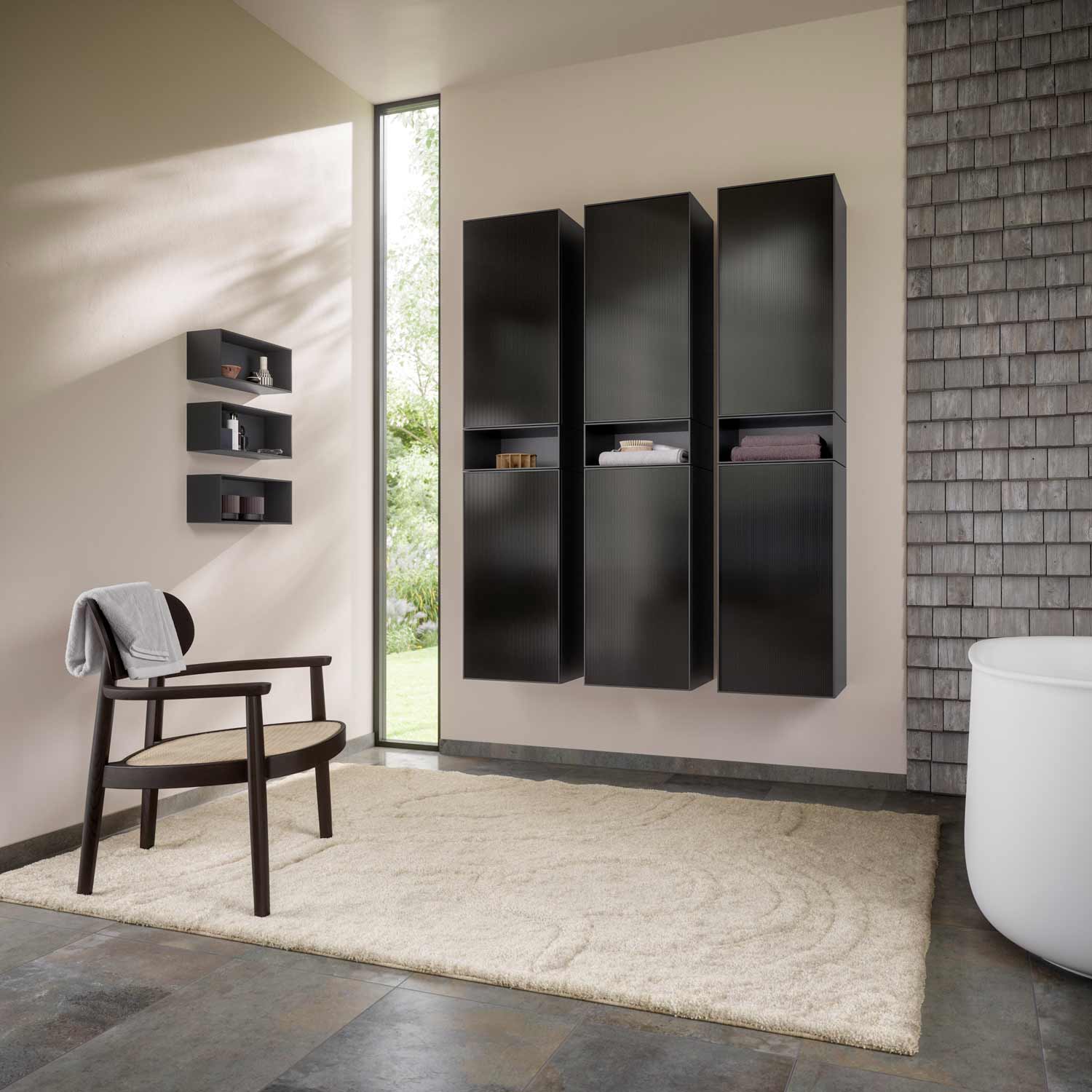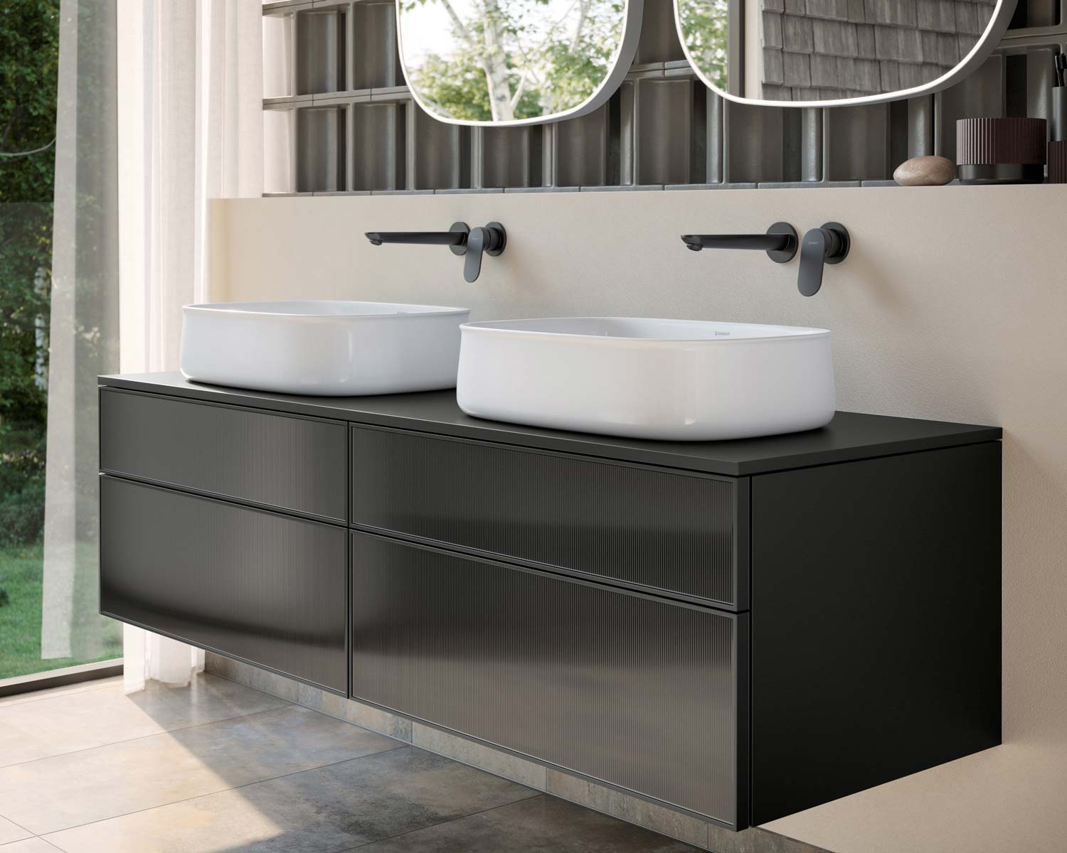 The double washbasin stands out thanks to its two spacious above-counter basins, picking up on the formal language of the bathtubs. The minimalistic, graphite-colored bathroom furniture with a textured glass front creates a harmonious visual contrast and underpins the elegant lightness with its delicate frames.