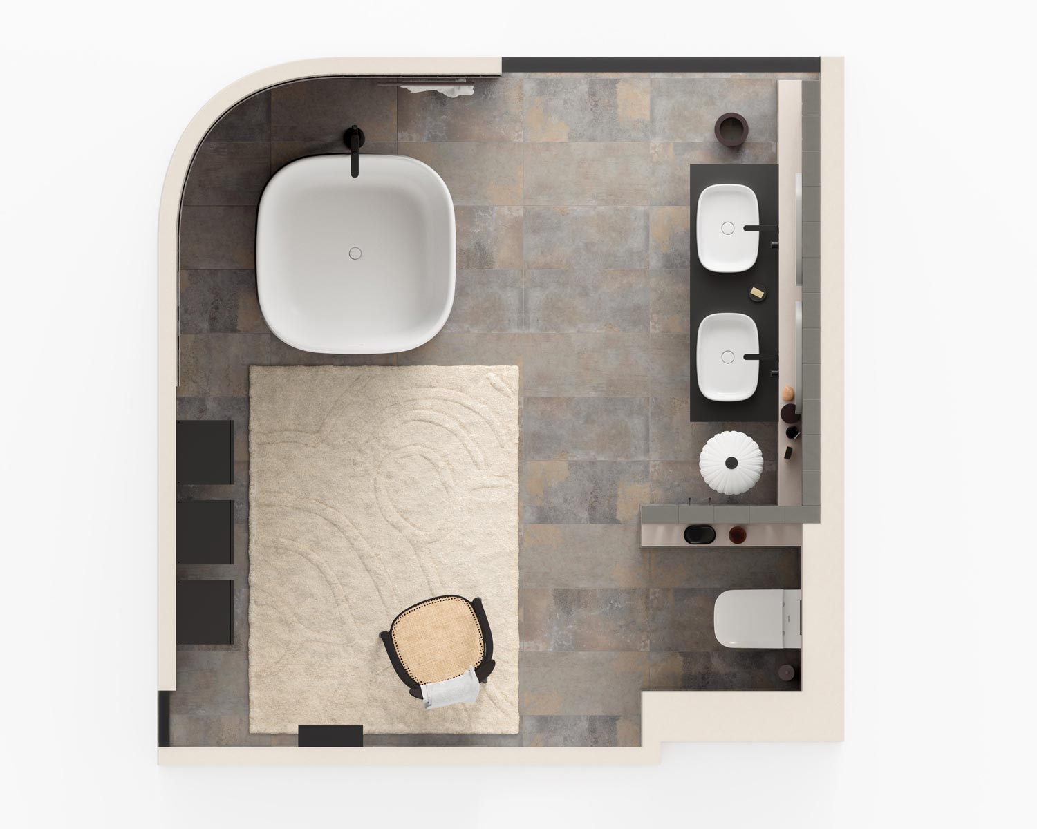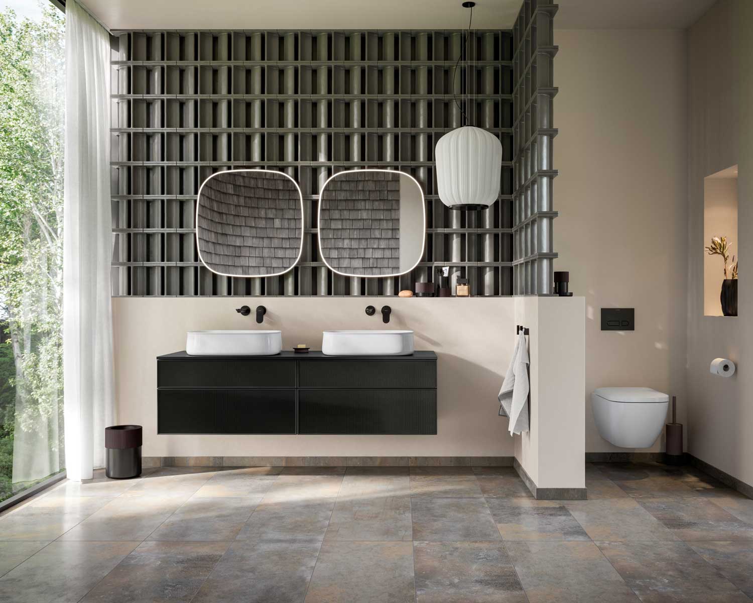 Sebastian Herkner opted for a double washbasin to manage the challenges of everyday life. The vanity units ensure visual order, the spacious above-counter basins made of DuraCeram® and matching mirrors offer space for personal hygiene.