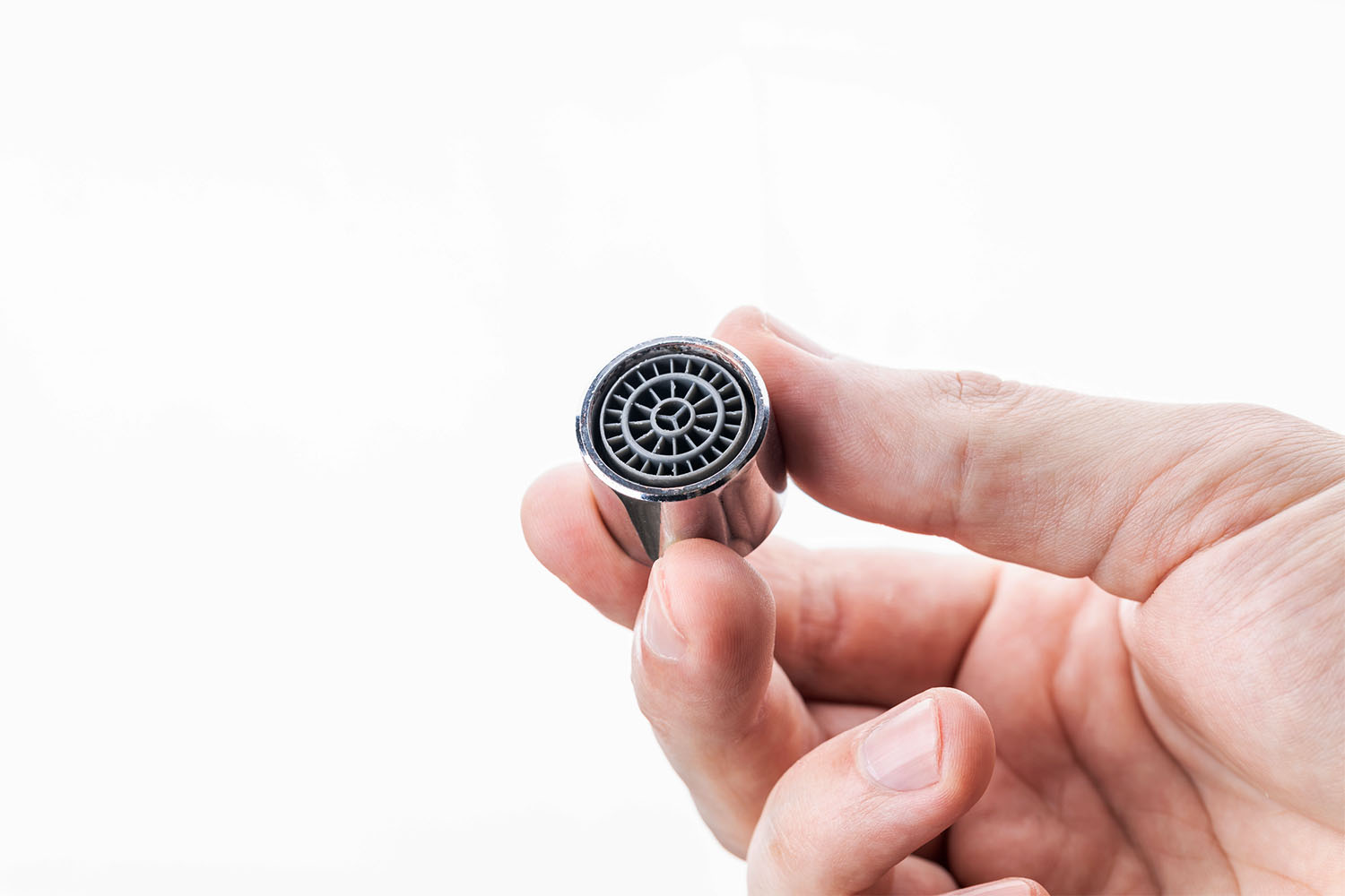 Then you can easily dismantle the aerator into its three component parts – screen, nut and sealing ring. You can descale the nut and the faucet screen by soaking them in a mixture of descaler and water. Don't soak the sealing ring in descaler, though. It's very easy to clean limescale off of it and the plastic can become porous after prolonged contact with descaler.