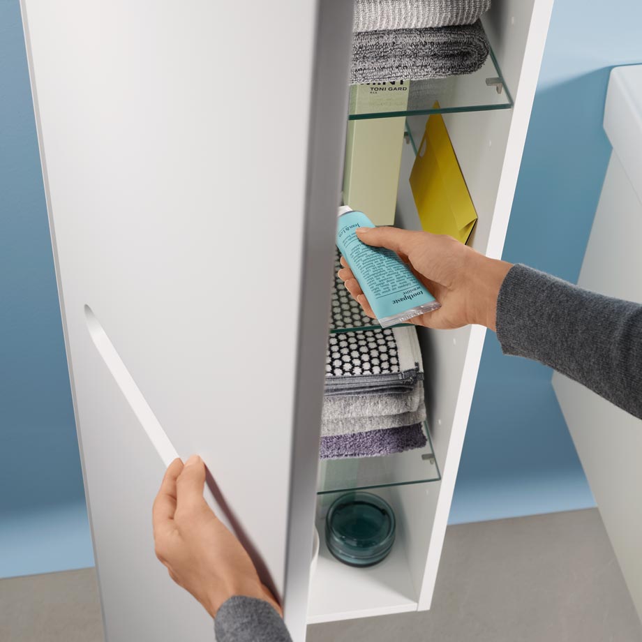 Bathroom accessories, cosmetics and personal care products add to the overall look. Beautifully designed products can create a visual appeal and make your bathroom look even more elegant. For optimal tidiness in the bathroom, you should also combine matching colors and sizes – you can store any items that don't match in a cabinet.
