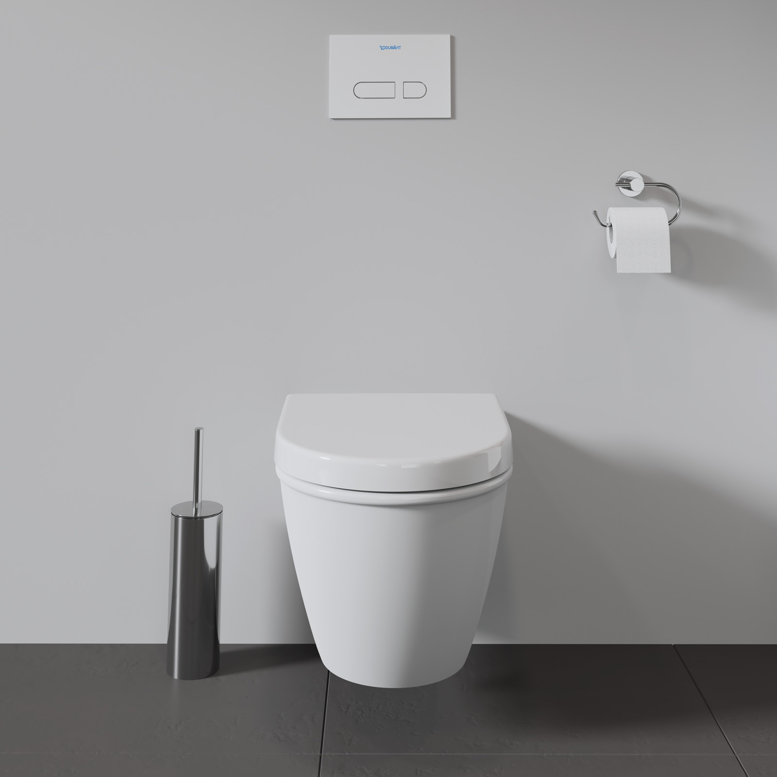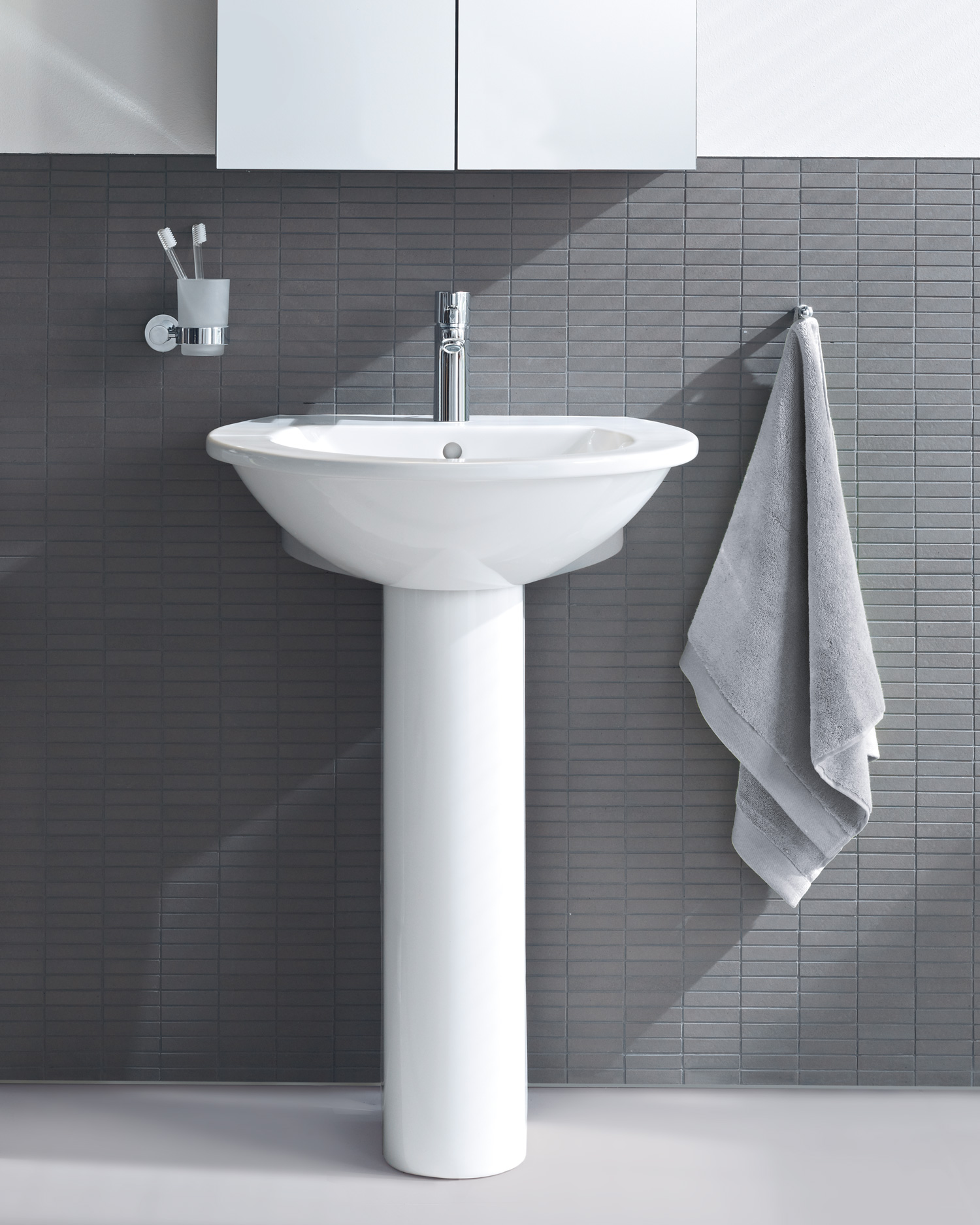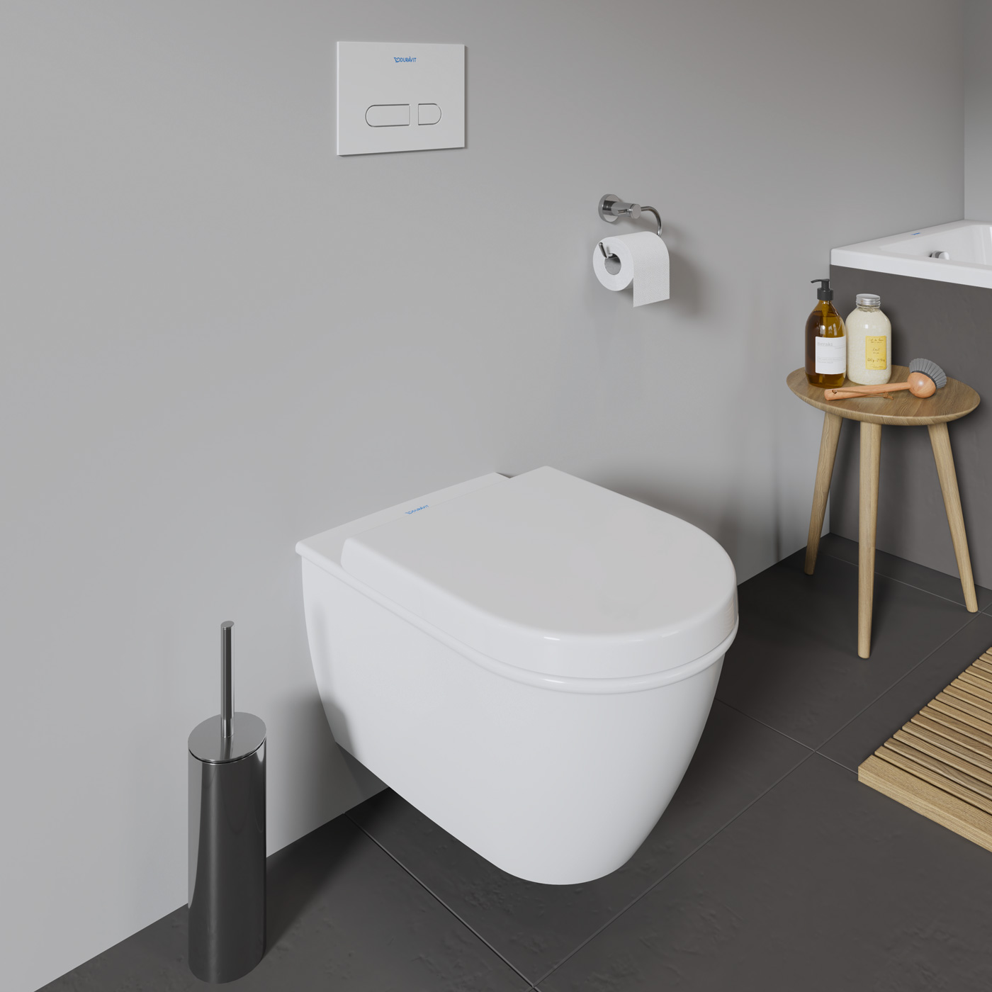 Duravit Darling New products work especially well with accessories from the Starck T design series. The iconic shape of the bathroom accessories fits right in with the overall aesthetic created by the circular shapes of Darling New.