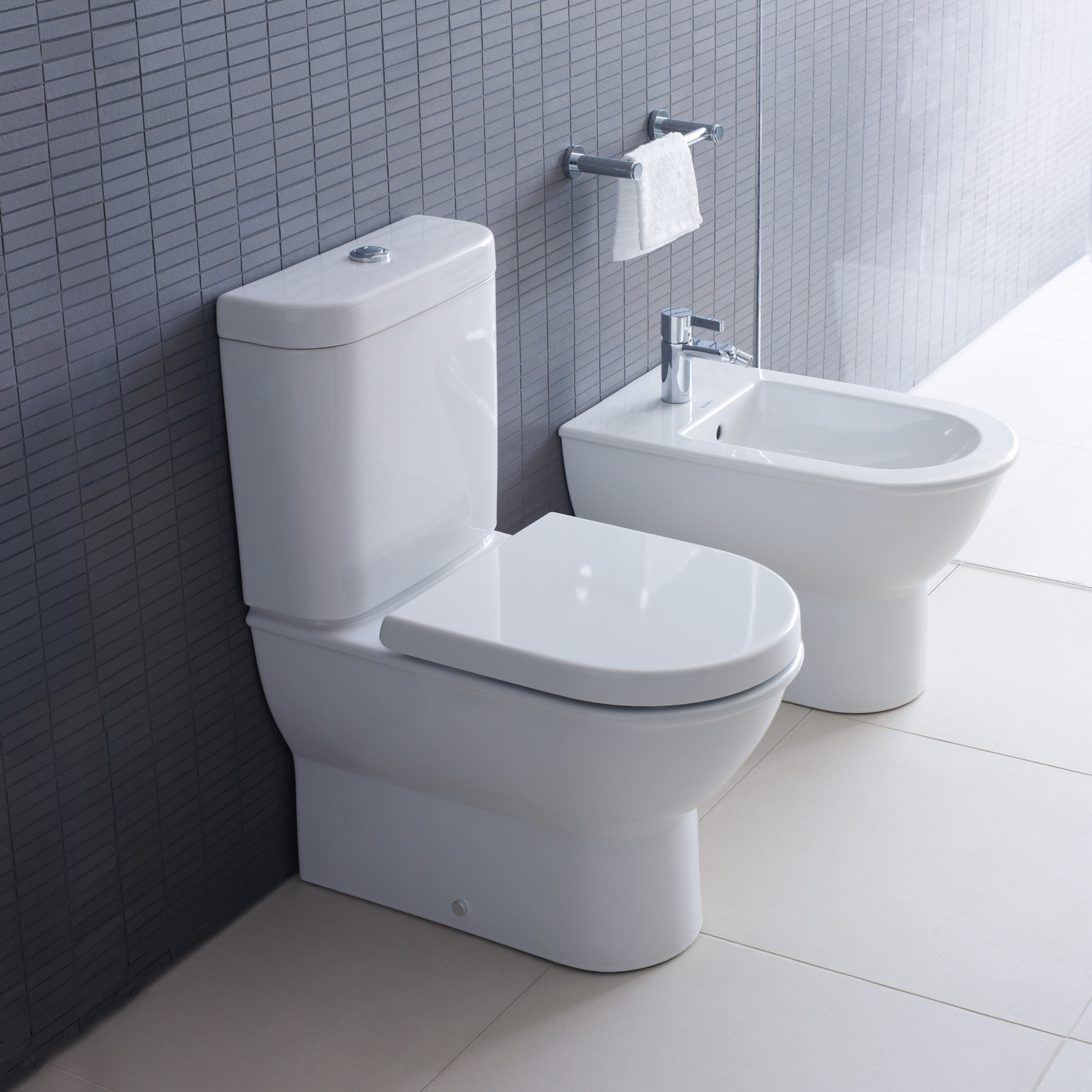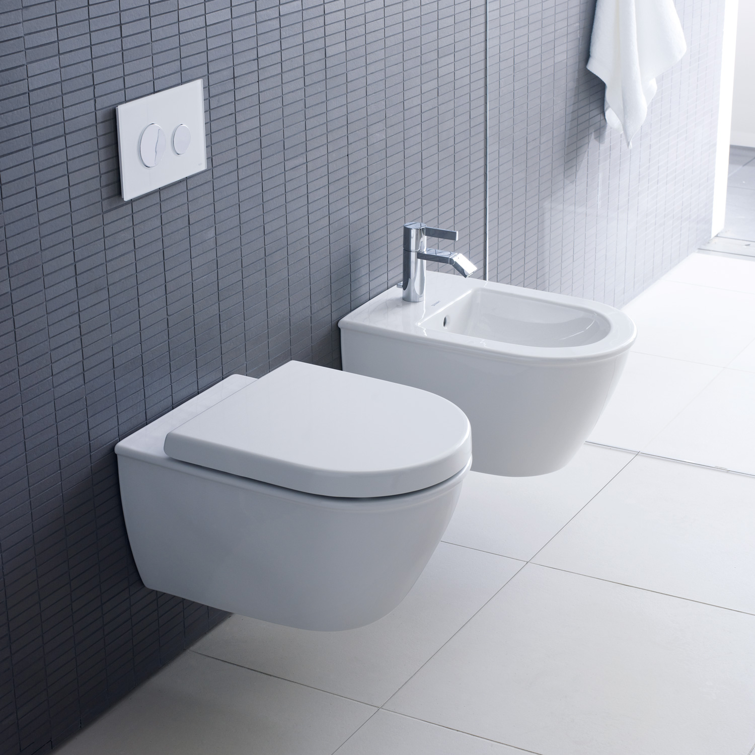The toilets and bidets in the Darling New series are available either as free-standing or wall-mounted versions. The free-standing toilets are also available with a back-to-wall installation. The Darling New wall-mounted toilets with closed side panels are particularly elegant, and there aren't any visible attachment points thanks to the patented Durafix system. The wall-mounted toilets are also available in different sizes so you'll find the right solution for every bathroom. The antibacterial ceramic glaze HygieneGlaze® helps to ensure the highest levels of hygiene around the toilet. Toilet seats with slow-close lids are also available.
