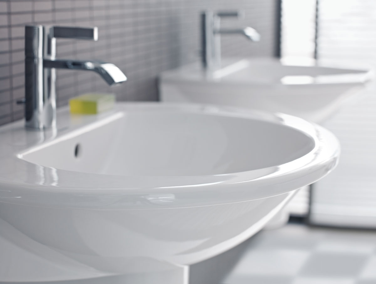 New c-bonded technology: the washbasin with a more spacious inner basin and a large storage area on both sides. The Darling New ceramic series is designed by sieger design.