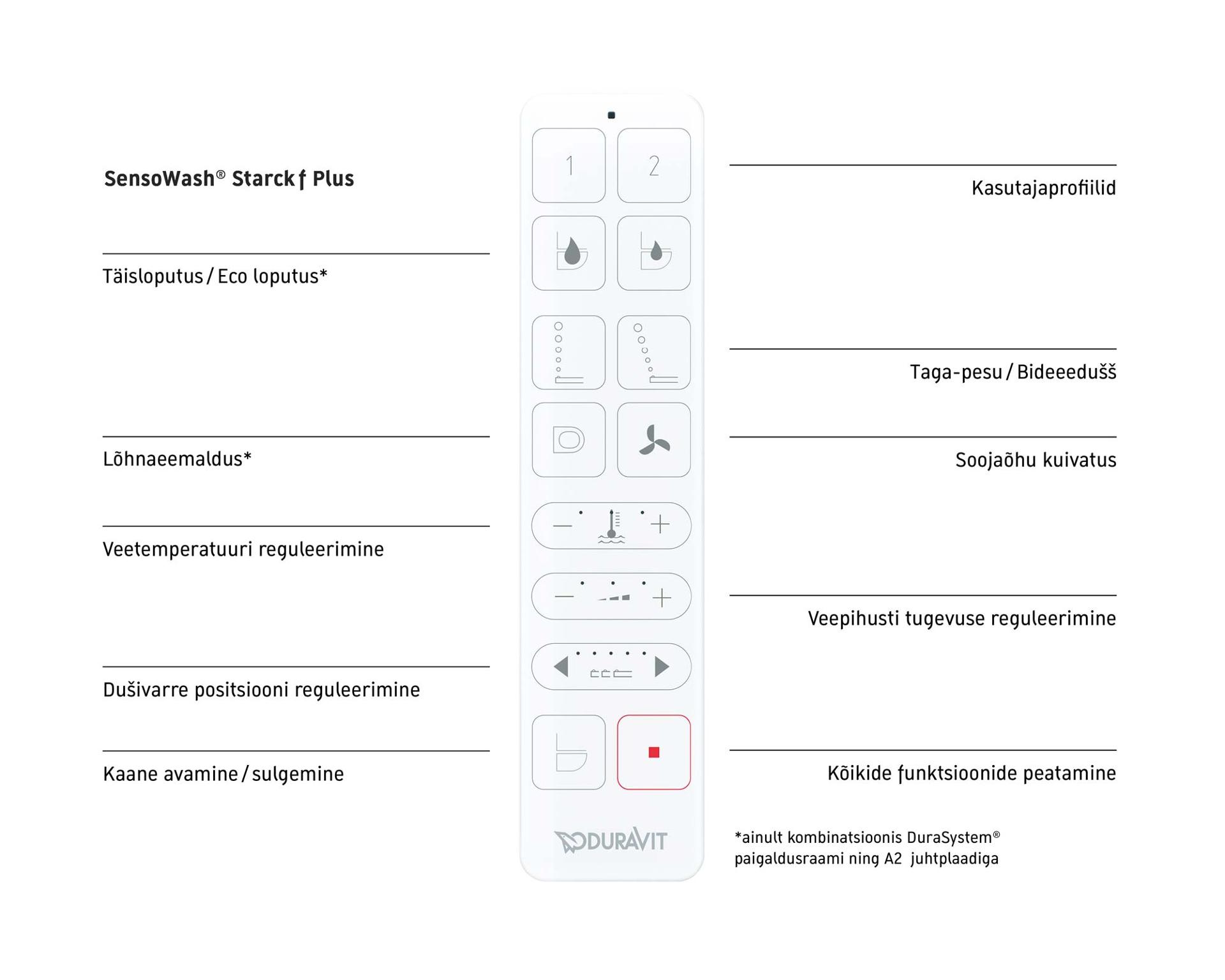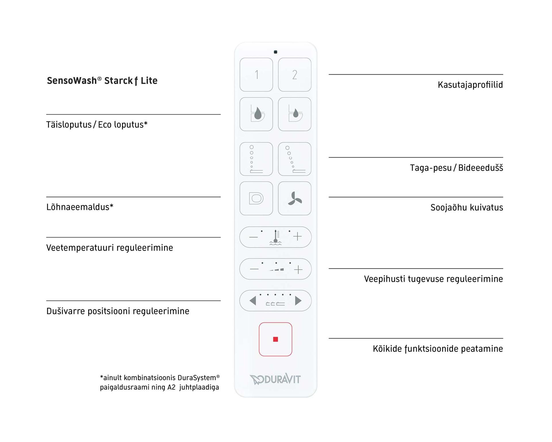 Ülima mugavuse annavad mitmed tehnilised detailid, nagu liikumisandur kaane automaatseks avamiseks ja lai valik sätteid, mille abil saab muu hulgas reguleerida istmesoojendust, veetemperatuuri ning sooja õhuga kuivatit. Tänu oma kompromissitult puristlikule disainile sobitub SensoWash® Starck f kõigi Duravit vannitoakollektsioonidega.