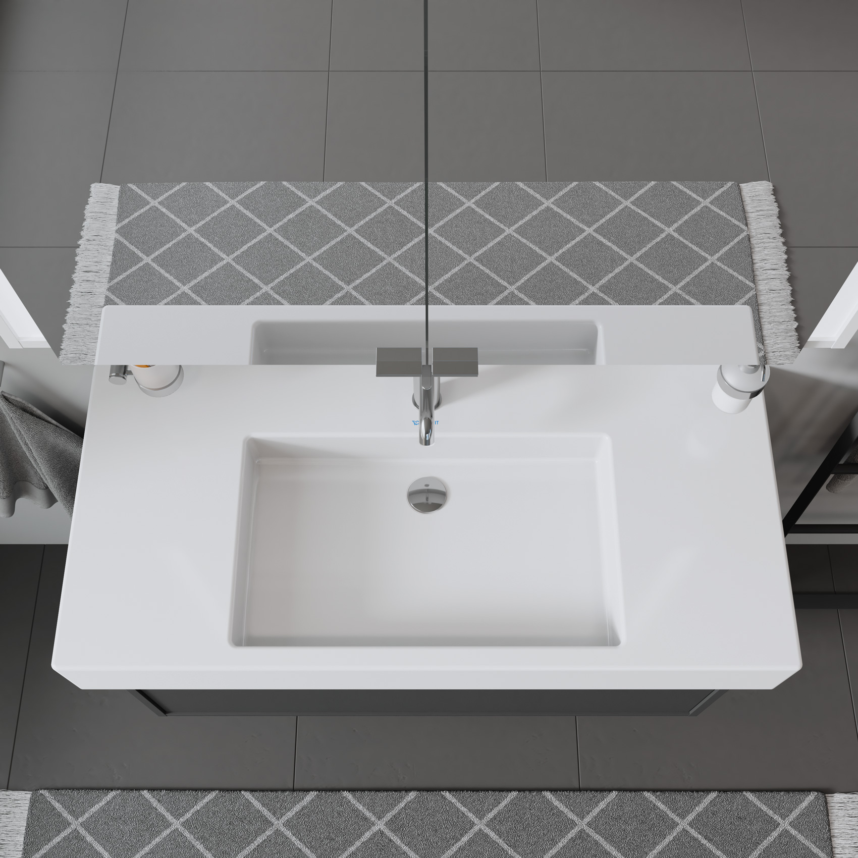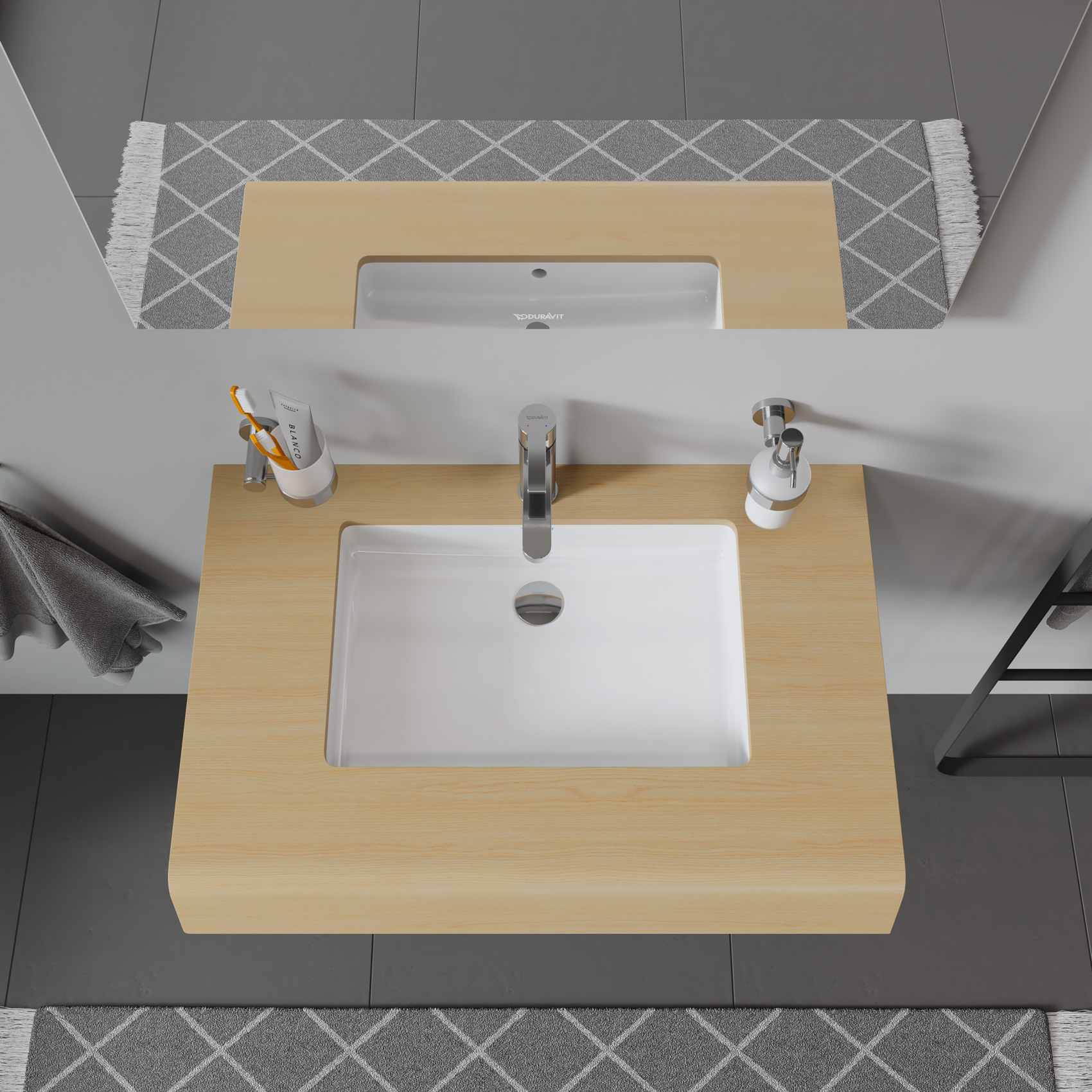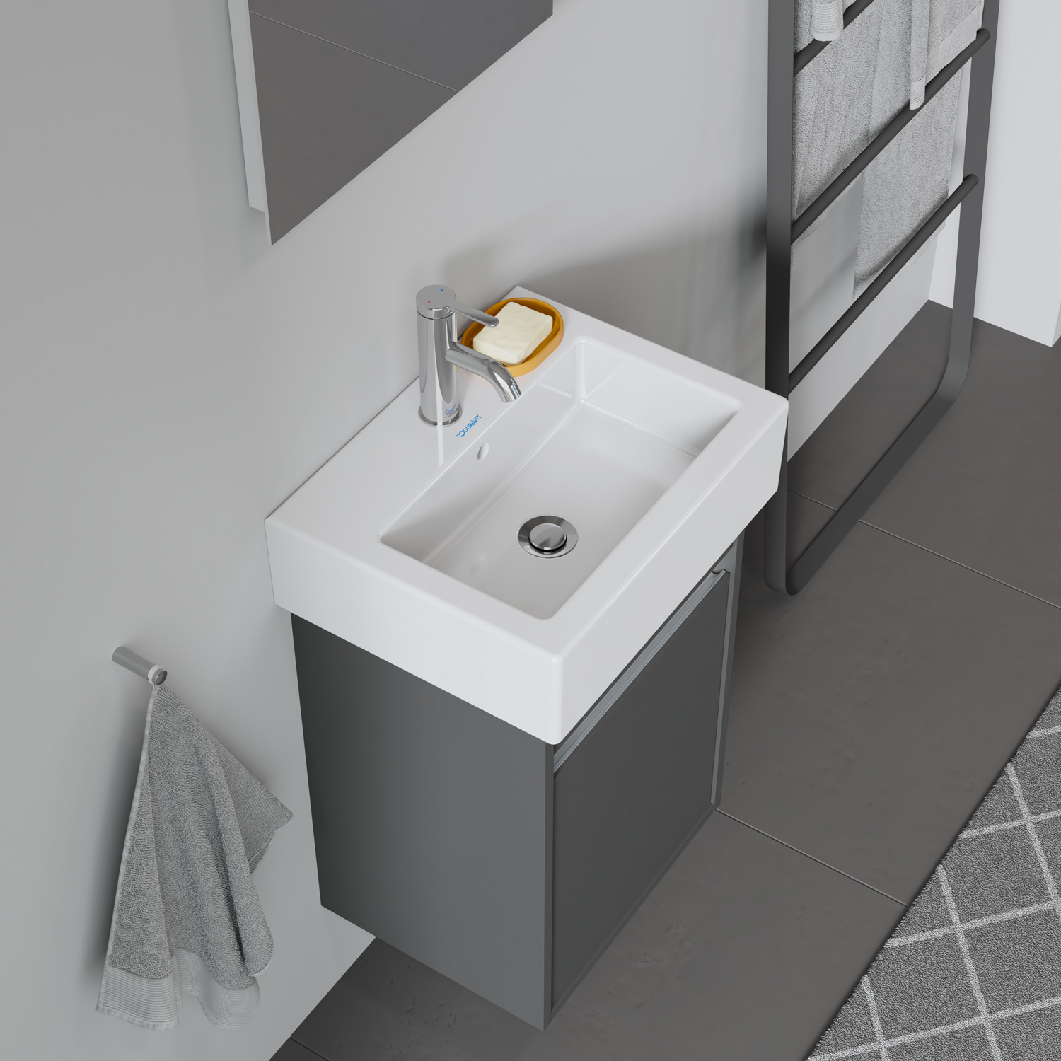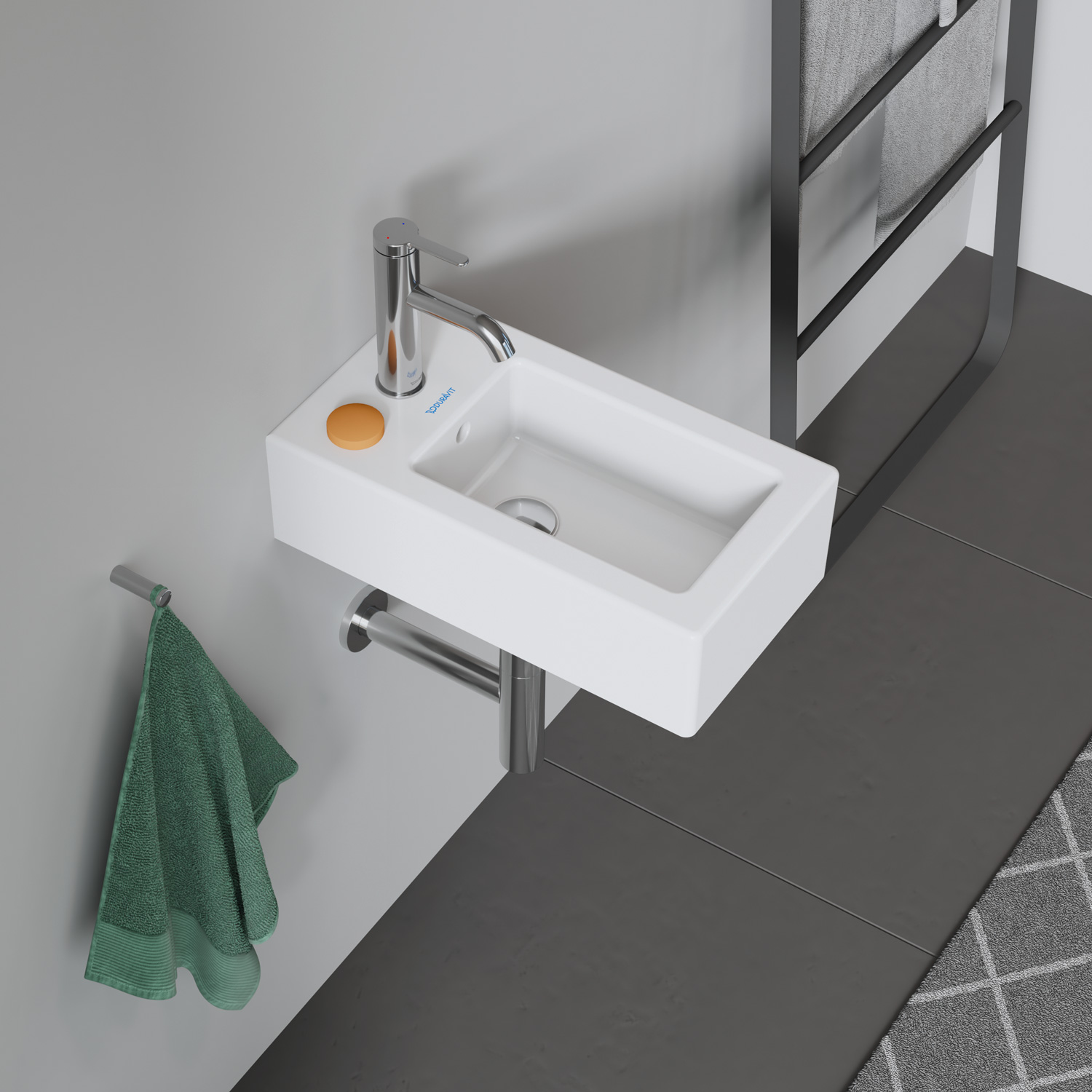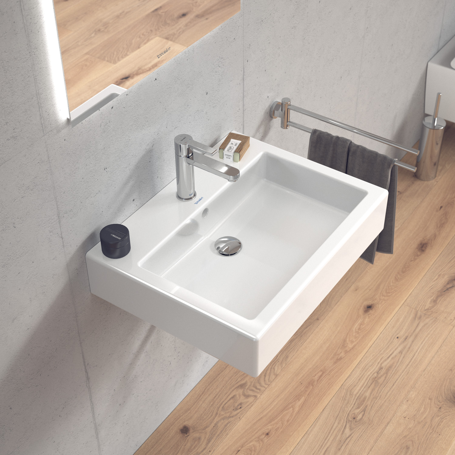 The rectangular shape has proven to fit well in spaces of all sizes. Available in a number of different sizes, they also work well in smaller rooms like a guest bathroom. The Duravit Vero hand wash basins are available in widths from about 10 to 20 inches (25 to 50 cm) and in a variety of different styles: along the wall, with the faucet on the side, with a larger inner basin, and with or without a shelf.