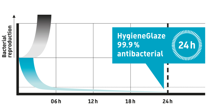 Compared with ceramics with conventional surface glazes, HygieneGlaze® inhibits 99.9 percent of bacteria growth within 24 hours. The effectiveness of the HygieneGlaze® antibacterial properties has been scientifically proven by hygienic and microbiological tests performed by the Institute for Hygiene and Public Health at the University of Bonn: the special glaze kills bacteria and germs.