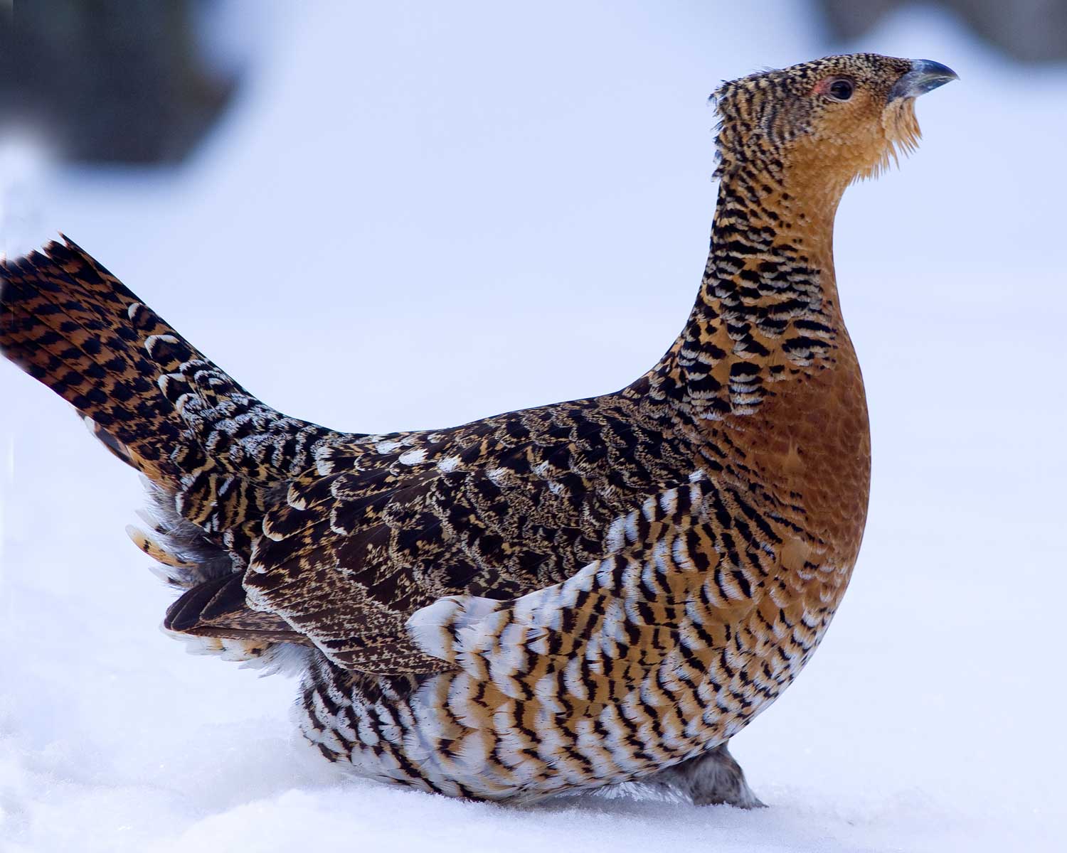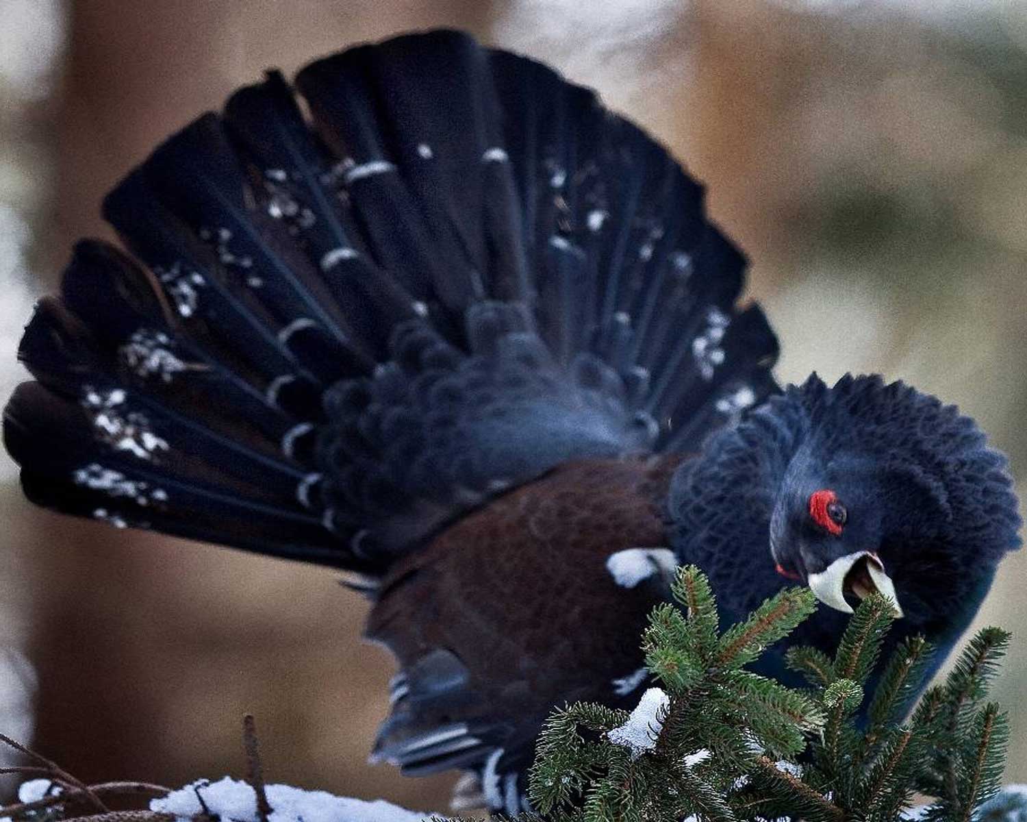 Unlike other bird species, the wood grouse doesn’t migrate south for the winter. Instead, it adapts to the low temperatures with thick plumage and stays at home.