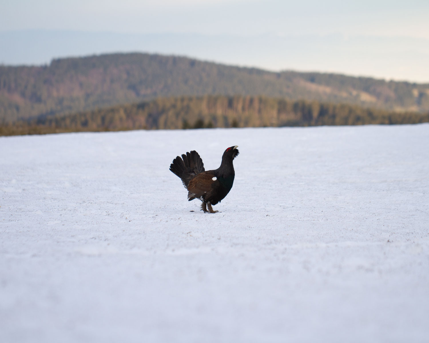 Despite its warming plumage, the wood grouse needs to minimize its energy consumption. If they are disturbed by people straying from marked paths at this time, their flight response causes their metabolism to rapidly shoot up. That takes a lot of strength, causing lasting weakness to the animal – and can even result in death.