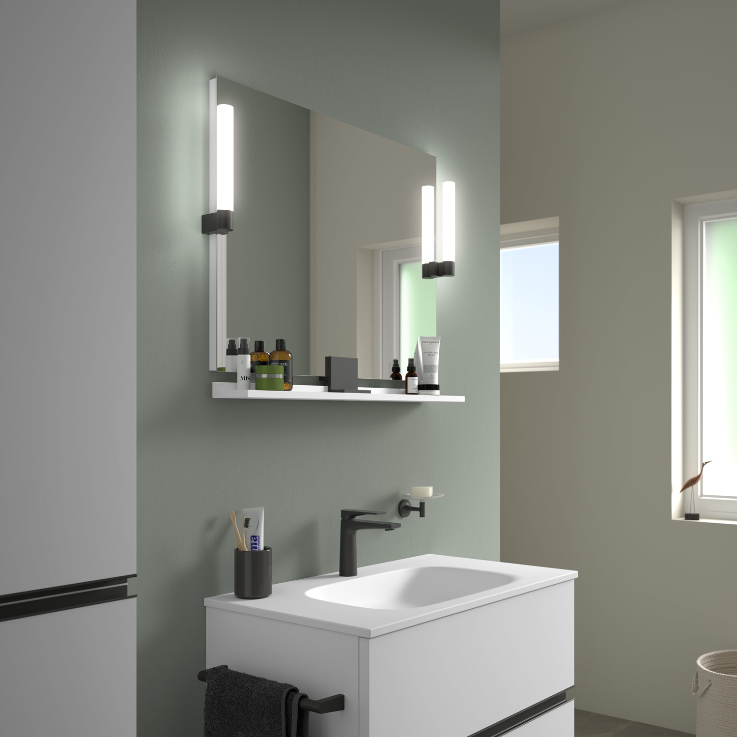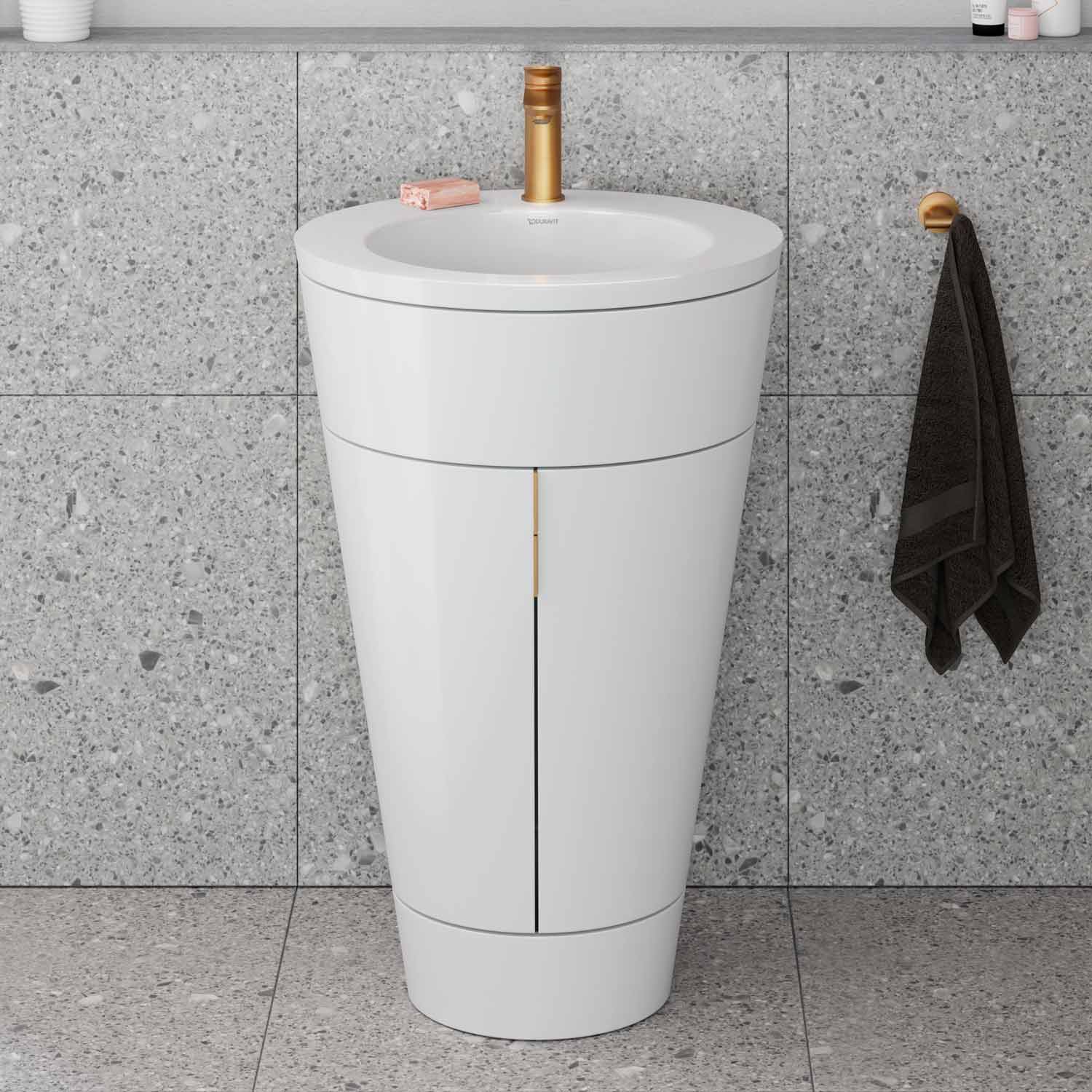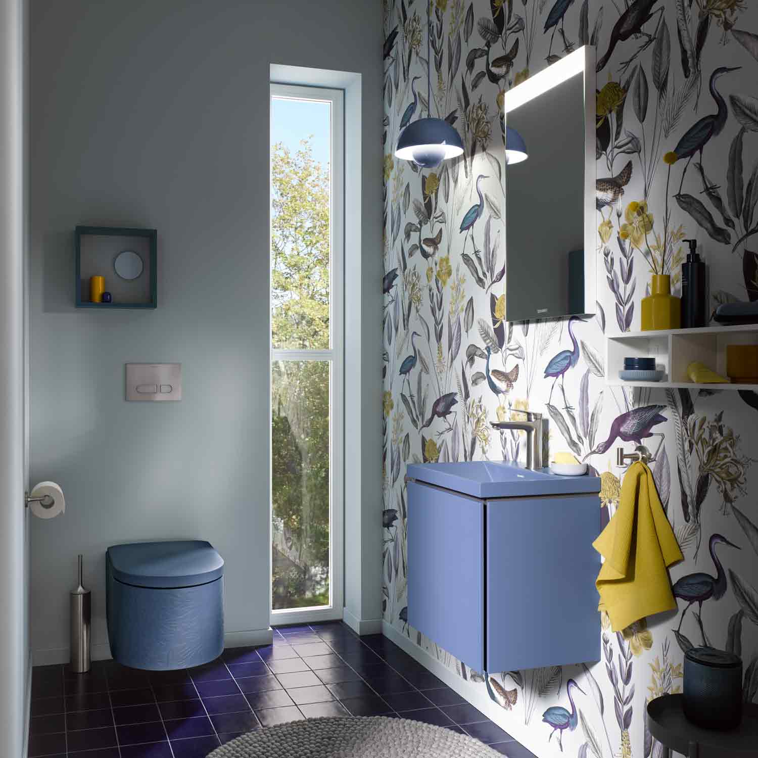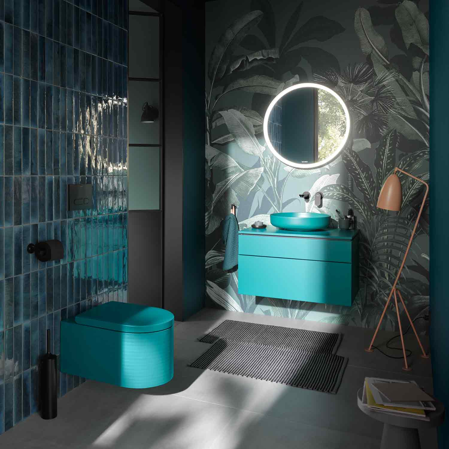 Unique wall concepts and colorful bathroom objects combine to create a strong design statement