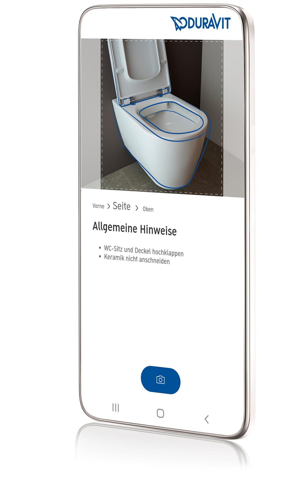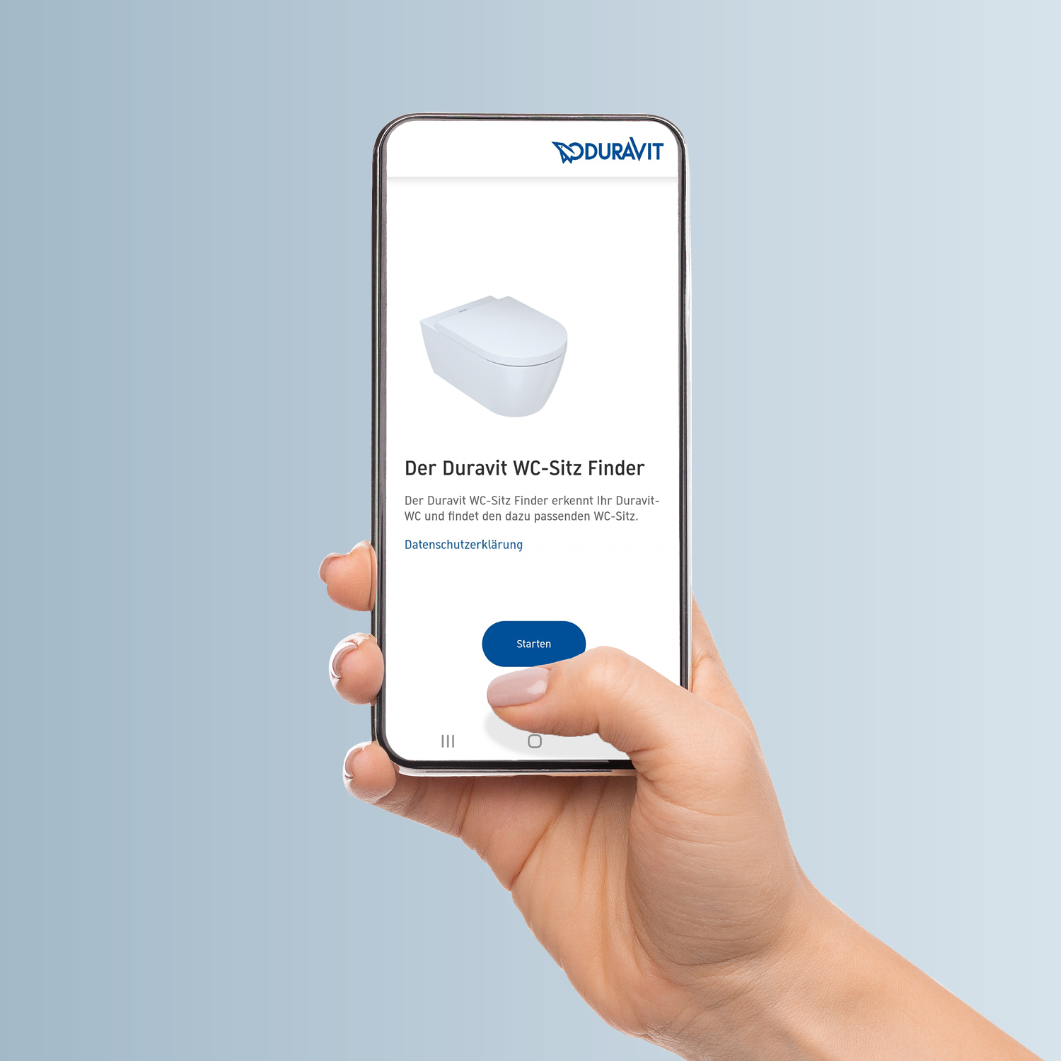 Simply open the mobile app on your smartphone – it will guide you quickly and intuitively through each of the Duravit Toilet Seat Finder steps. Don't worry: the relevant screens will help you take the photographs and show you the angle required. Once you've taken the pictures, your Duravit toilet will be recognized in just a few seconds.