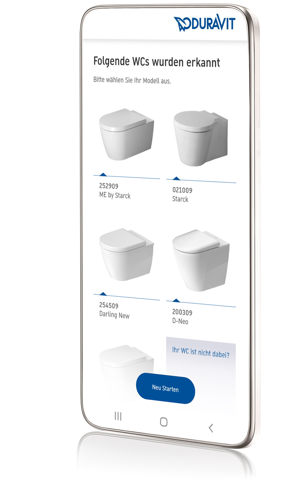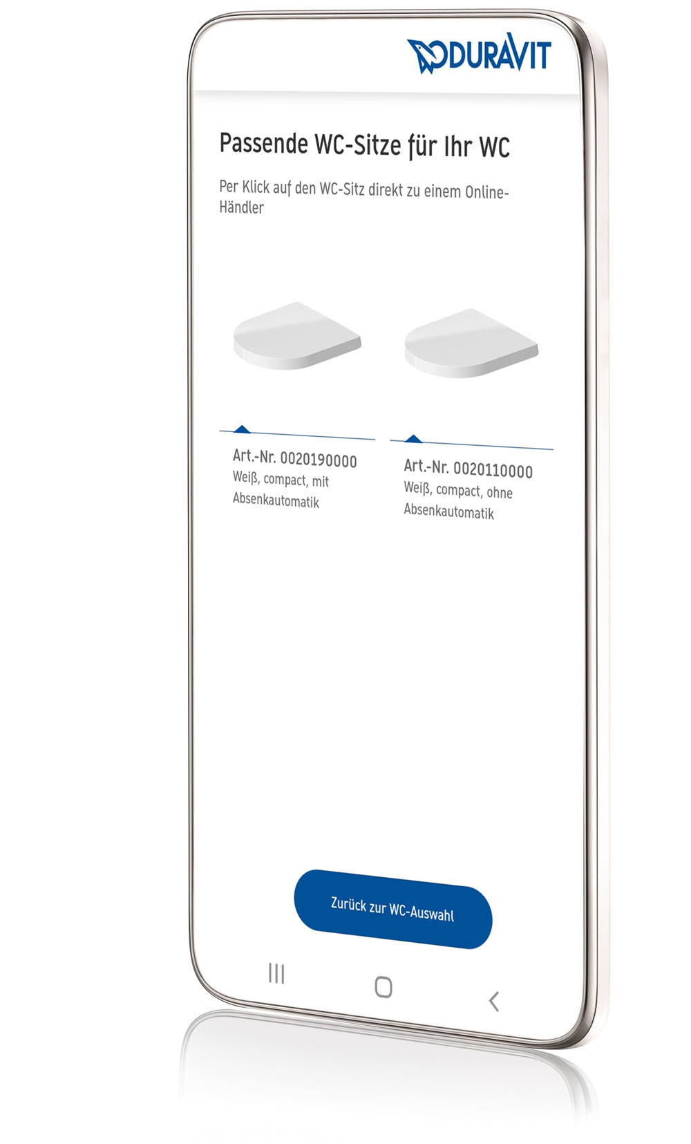 After the photographs have been successfully uploaded to the Toilet Seat Finder, you will receive several possible Duravit toilets, listed in order of probability, with the corresponding model number. Click on the model you have to get a selection of corresponding item numbers for compatible Duravit toilet seats.